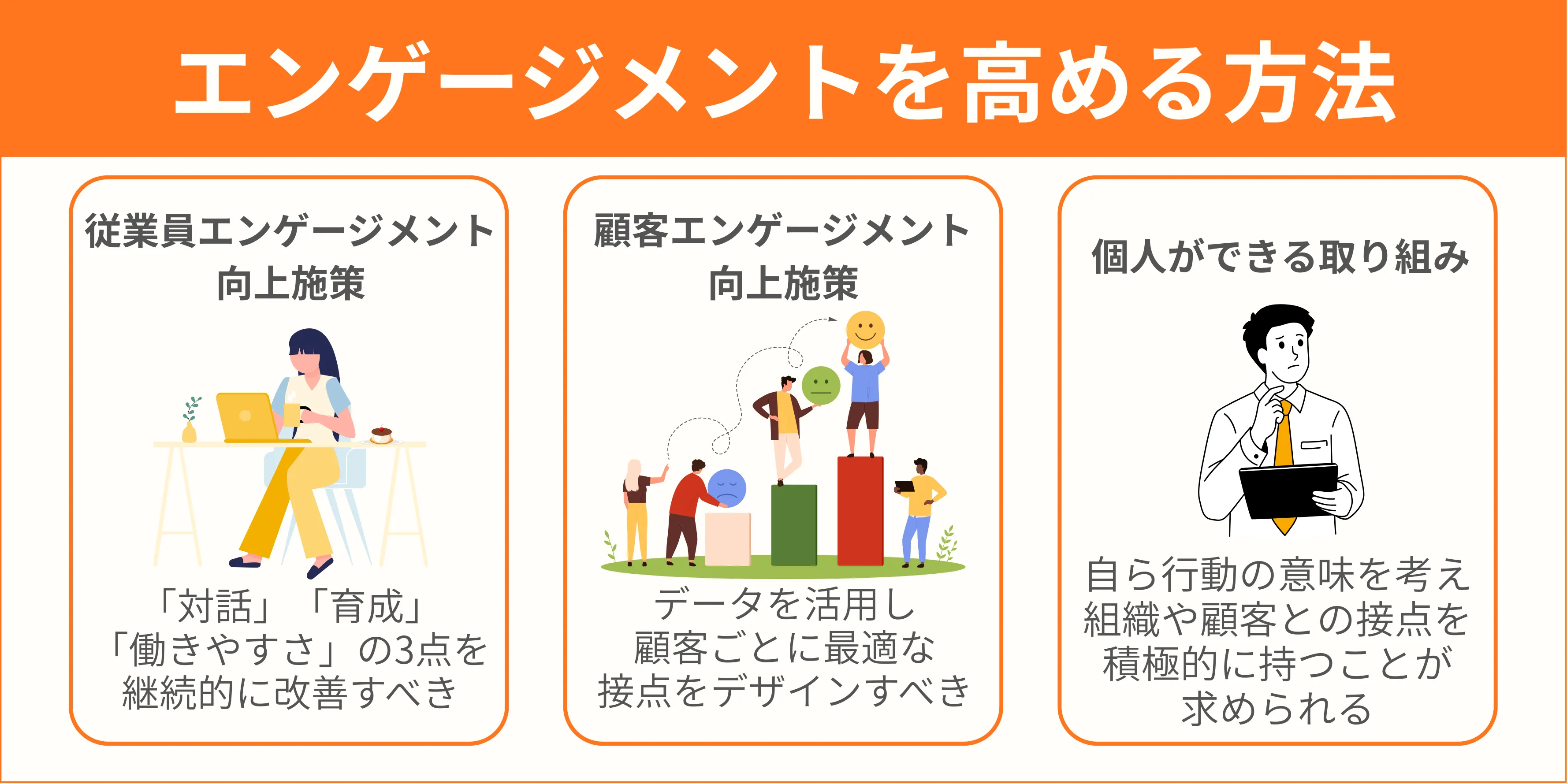 エンゲージメントを高めるには、従業員と顧客の両方にアプローチし、さらに個人の取り組みも組み合わせる必要があります。ここでは3つの方向性から改善の手法を整理します。